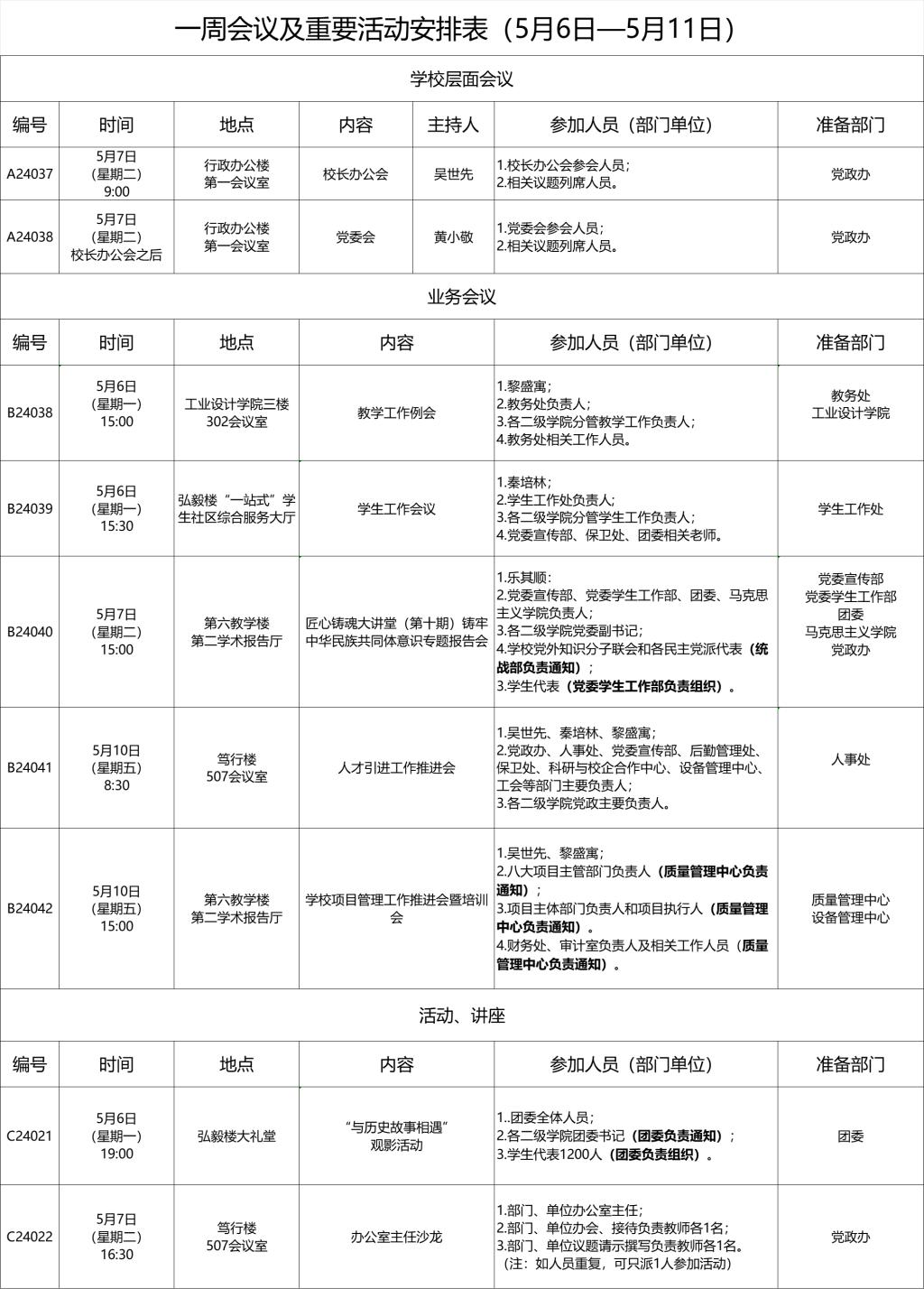 一周会议及重要活动安排表(5月6日—5月11日)