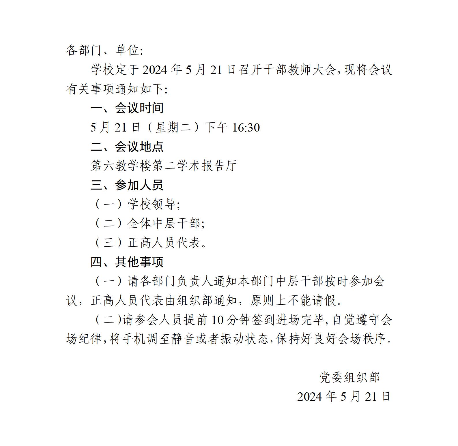 关于召开学校干部教师会议的通知