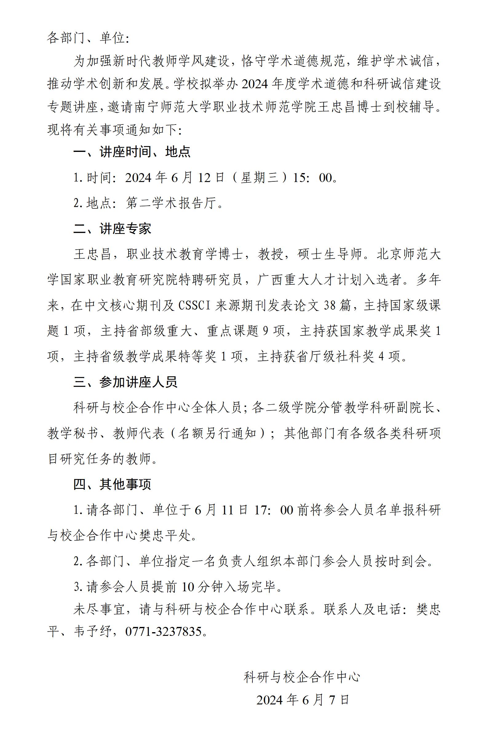 关于举办2024年度学术道德和科研诚信建设专题讲座的预通知