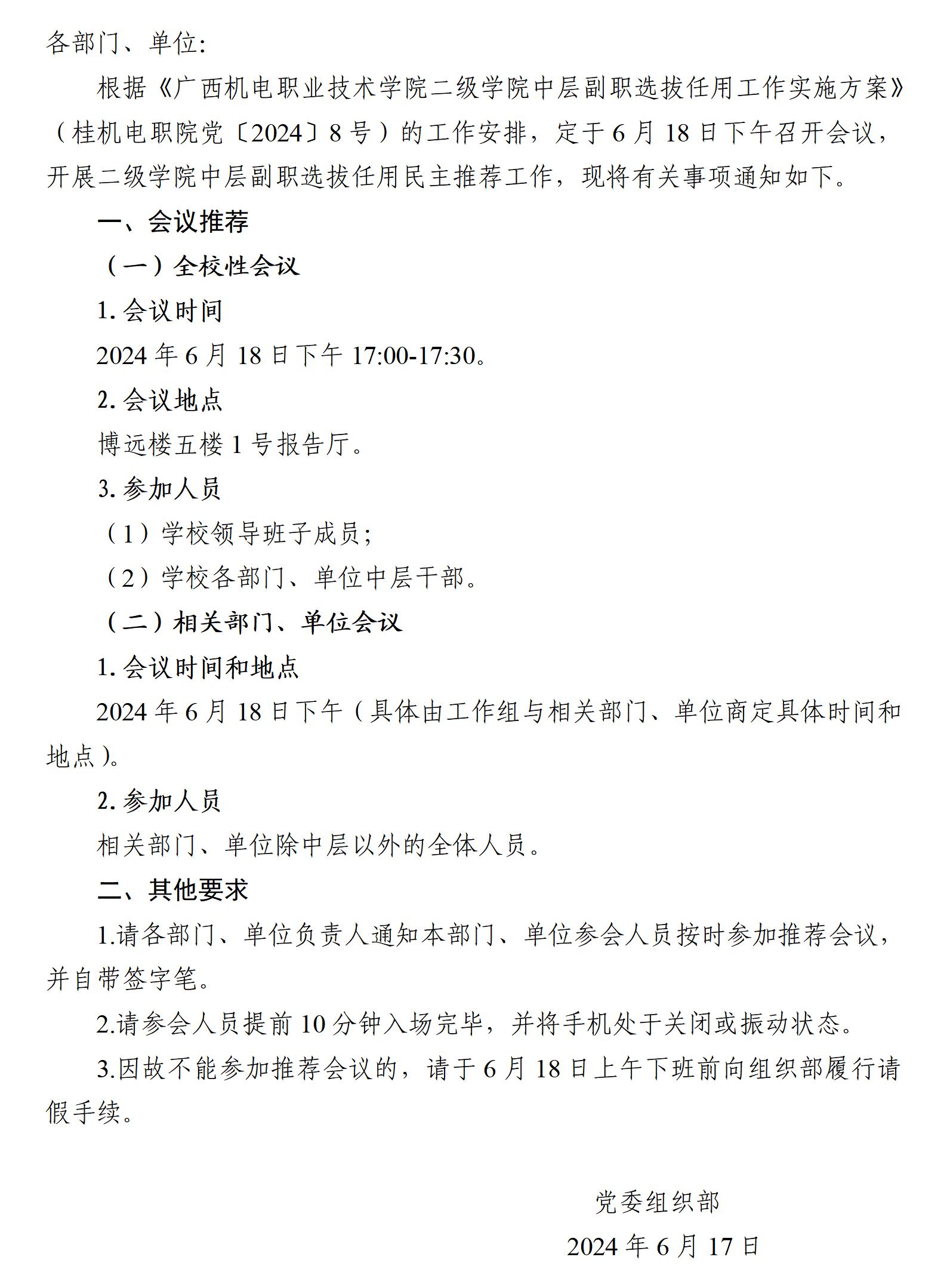 关于召开干部选拔任用民主推荐会议的通知