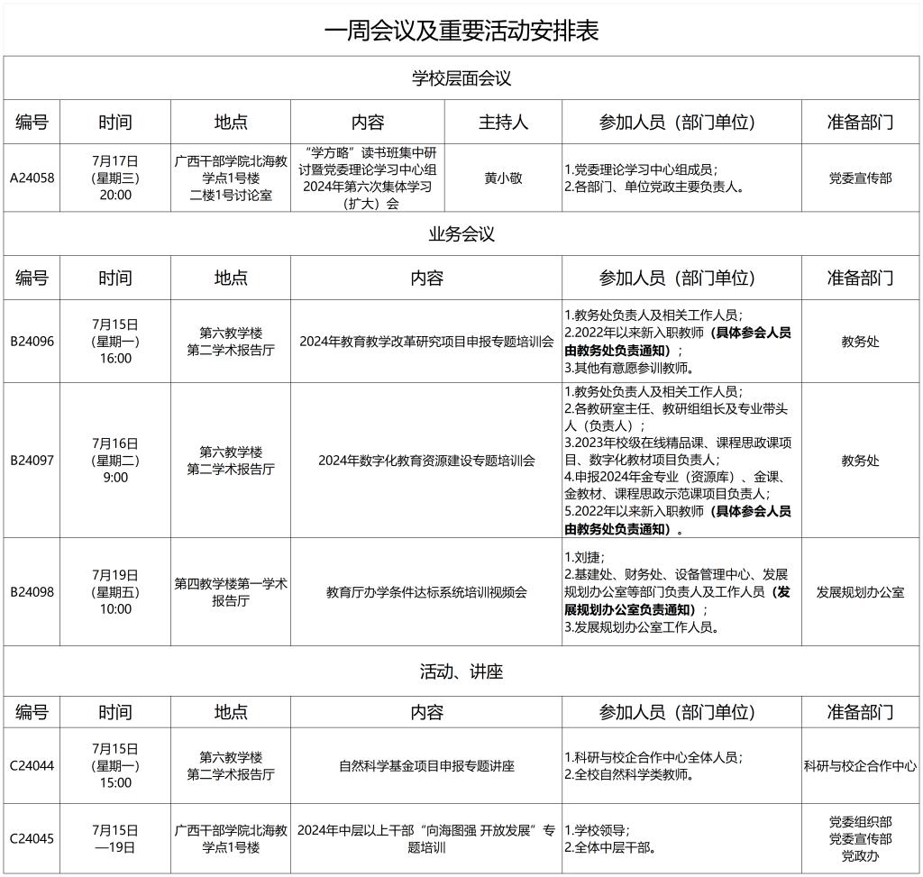 一周会议及重要活动安排表(7月15日至19日)