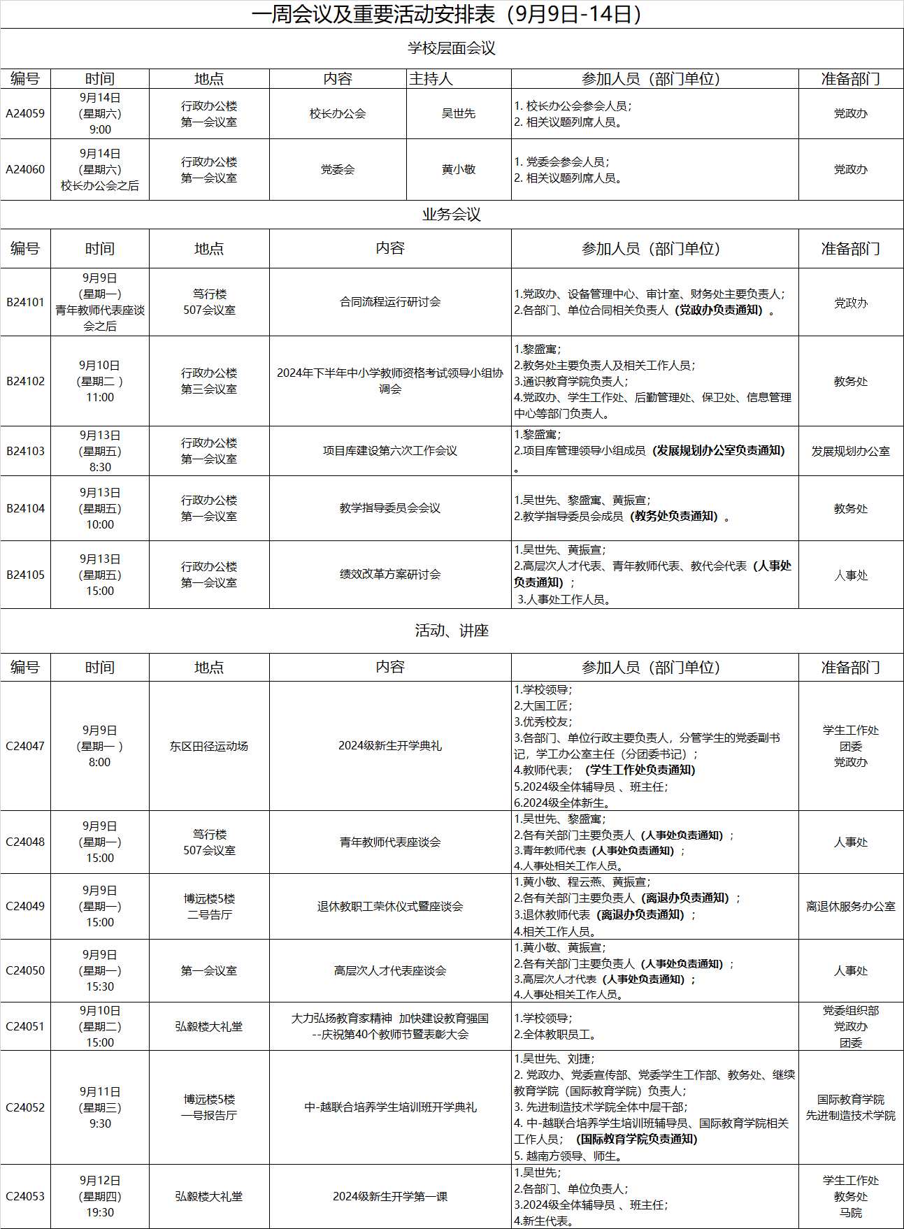 一周会议及重要活动安排表(9月9日-14日)