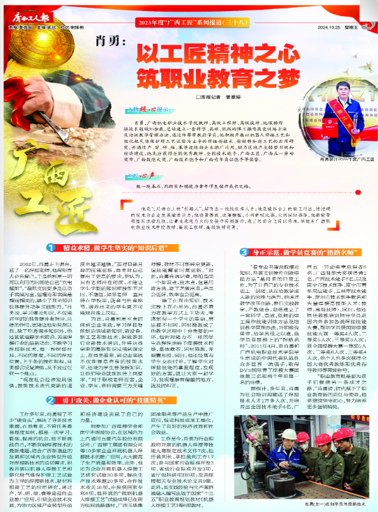 人物核心提示:肖勇,taptap点点官网教师、高级工程师、高级技师。他深耕焊接技术领域20余载,总结建立一套科学、高效、低耗的焊工操作技能训练方法及培训教学管理办法,通过传帮带教授学员。他积极开展以机器人焊接工艺和熔化极气体保护焊工艺试验为主导的焊接新技术、新材料和新工艺的应用研究,并通过产、学、研、培、赛等途径向企业推广应用,助力区域产业转型升级和经济建设。他先后获得全国优秀教师、全国技术能手、广西工匠、广西五一劳动奖章、广西技能大奖、广西技术能手和广西青年岗位能手等荣誉。