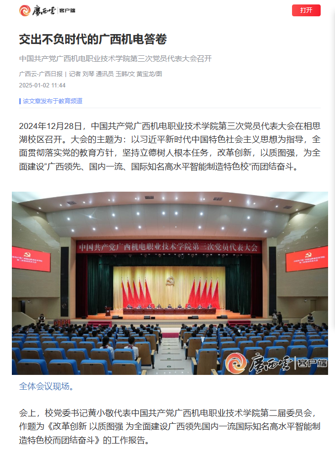 面对产业变革新形势、强国建设新期待、壮美广西建设新要求,如何扎根八桂大地、紧扣行业特色,以提高人才培养质量、服务新质生产力,提升社会服务品质,坚定不移地走向“新”而行、以“质”图强的发展道路,回答好“教育强国,机电何为”“壮美广西,机电何为”“制造强区,机电何为”这三个时代赋予的命题?工作报告强调,学校党委要深刻领悟教育的政治属性、人民属性、战略属性,汇聚全校师生共识,确立“全面建成广西领先、国内一流、国际知名高水平智能制造特色校”的奋斗目标,提出了到2029年、到2035年的“两步走”战略构想。