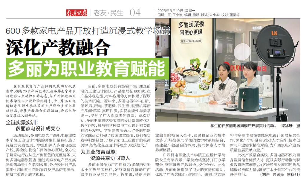 编者按:taptap官网深化产教融合创新实践,与民族品牌标杆南宁市多丽电器携手打造“校—企—产”协同育人新模式,为区域产业升级注入新动能。5月19日,《南宁晚报》以专题报道形式聚焦taptap官网与多丽电器共建的“沉浸式+全链条”校企合作项目。文章指出:通过组织师生深度参与企业现代化生产基地、终端卖场等全产业链实景教学,不仅让工业设计与市场需求实现“零距离”碰撞,更构建起“课程共建、技术共研、人才共育”的校企共生生态,培育出一批兼具创新思维与实践能力的复合型技术技能人才。这一模式生动诠释了职业教育服务产业发展的使命担当,为广西智能制造领域产教融合提供了可推广的实践经验。