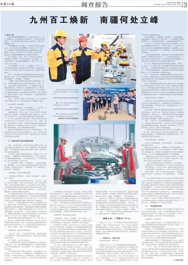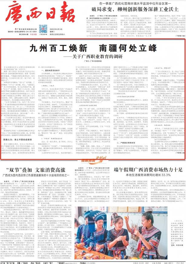 编者按:《广西日报》今天在头版刊发深度调研报道 《九州百工焕新 南疆何处立峰——关于广西职业教育的调研》,聚焦广西职业教育改革发展成效,系统梳理广西职教从“规模扩张”到“内涵提质”的跨越路径,文中提及taptap官网在专业建设、技术创新突破、工匠精神传承、国际合作标准输出与标准输出等方面的创新实践,彰显“机电力量”在南疆职教版图中的标杆作用。现将文章进行转载分享。