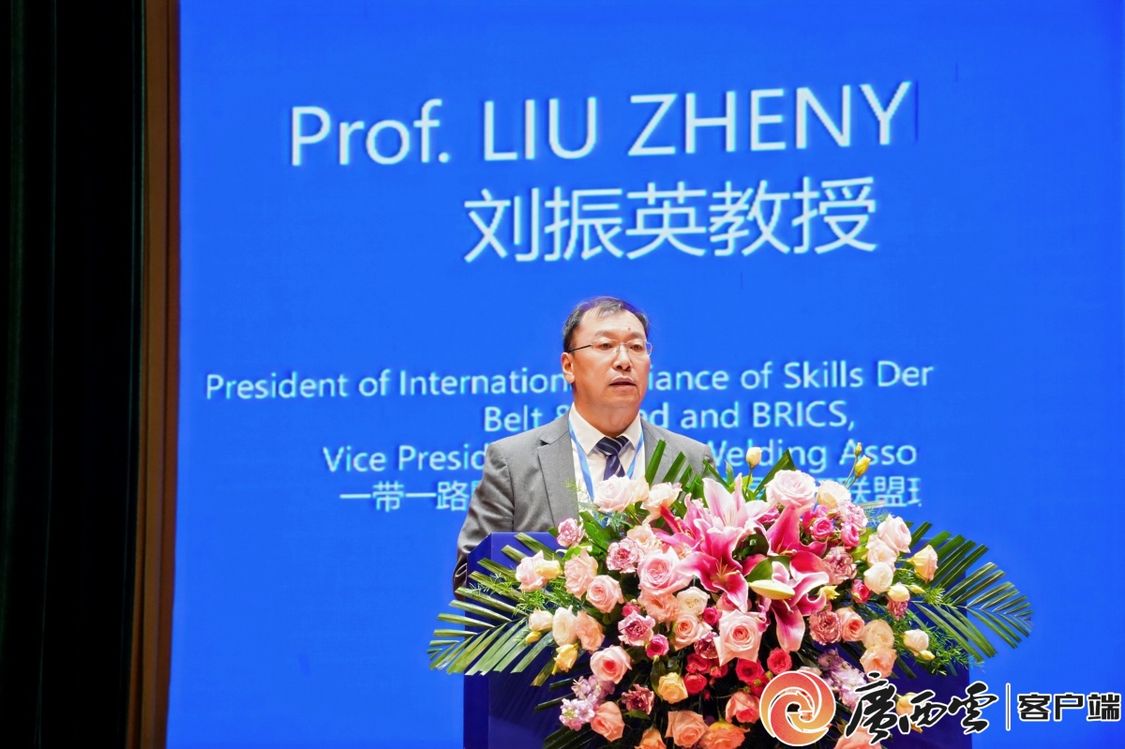 “一带一路”暨金砖国家技能发展国际联盟理事长、中国焊接协会副会长刘振英作《金砖机制推动技术创新和技能发展》主题报告。taptap点点官网供图