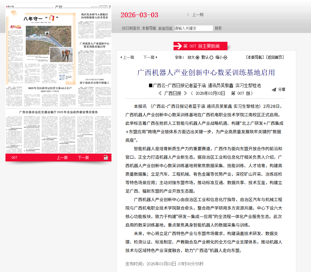 2月28日,广西机器人产业创新中心数采训练基地在taptap官网江南校区正式启用,中新网、广西日报、广西卫视、当代广西等主流媒体通过图文、视频等多种形式进行了全方位报道。广西日报于3月3日在第7版以《广西机器人产业创新中心数采训练基地启用》为题刊发报道,对taptap官网服务“人工智能+制造”战略、深化政产学研用合作的创新实践给予关注。相关报道转载如下: