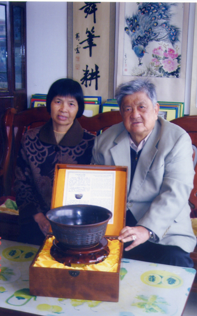 这件经中国——东盟博览会秘书处认定的国宾礼品——“连心碗”,是用我国四大名陶之首的广西钦州坭兴陶制成,由中国工艺美术大师李人帡先生设计的。碗体上的“和平、发展、繁荣、共赢”八个篆体字由广西著名书法家、中华诗词学会会员、中国书画研究院研究员白先智先生书写。碗体图案为中国与东盟10国国花,花之间有抽象的握手图案,象征中国与东盟10国手拉手、心连心,体现了“和平、发展、繁荣、共赢”的美好愿望。