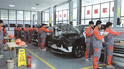 在交通工程学院的综合实训区,记者看到了建在实训区的党员活动中心(“党建”)、校企共建的五菱LING-LAB潮改直营店(“岗”)、为广西本土品牌汽车设立的专用教学区(“课”)、创新创业与技能大赛训练专区(“赛”)、新能源汽车“1+X”证书培训与考证专区(“证”)后,终于明白了“党建引领+岗课赛证融通”教学改革的含义,也真切地感受到了由此总结凝炼的《基于诊断与提升职业教育适应性的高水平专业群建设实践》这一自治区级教学成果奖的科学性与创新性。