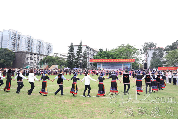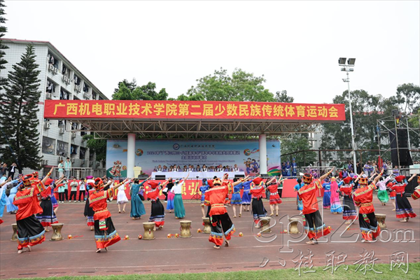 开幕式上,文体表演节目《铜鼓敲出壮乡情》将现场气氛推向高潮。演员们身着民族服饰,手持铜鼓,随着激昂的音乐跳跃舞动,充分展示了广西各民族的独特魅力和团结精神。在互动环节,师生们手牵手,共跳民族团结舞,寓意着各民族像石榴籽一样紧紧抱在一起,共同团结奋斗、共同繁荣发展,谱写民族团结进步的新篇章。
