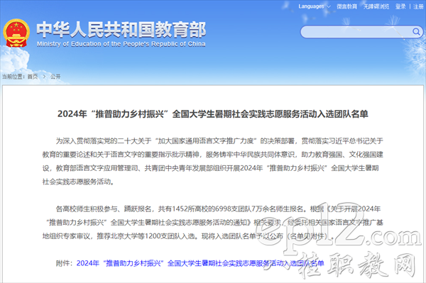 据悉,2024年“推普助力乡村振兴”全国大学生暑期社会实践志愿服务活动共有来自全国1452所高校的6998支团队报名参加,经过对各高校实践团的申报材料进行评审,全国共有1200支团队入选。活动旨在引导和教育广大青年学生志愿服务乡村推普工作,服务铸牢中华民族共同体意识,助力教育强国、文化强国建设。