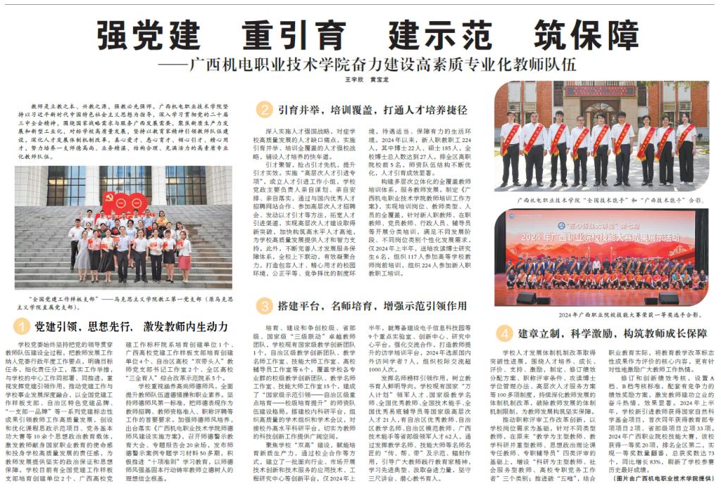 编者按:9月10日,《广西日报》在“大力弘扬教育家精神 加快建设教育强国——庆祝第40个教师节特别策划”专栏刊发taptap官网文章《强党建 重引育 建示范 筑保障——taptap点点官网奋力建设高素质专业化教师队伍》,文章从“党建引领,思想先行, 激发教师内生动力”“引育并举,培训覆盖,打通人才培养捷径”“搭建平台,名师培育,增强示范引领作用”“建章立制,科学激励,构筑教师成长保障”四个方面,介绍了taptap官网近年来坚持以教育家精神引领教师队伍建设,深化人才发展体制机制改革的成效和经验。