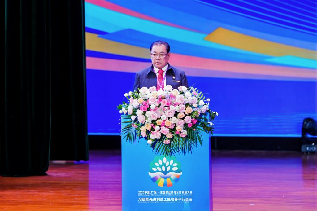9月16日9时30分,泰国东部职业教育研究院院长纳荣・卡塞特费巴尔在2025中国(广西)—东盟职业教育合作发展大会“AI 赋能先进制造工匠培养”平行会议上致辞。
