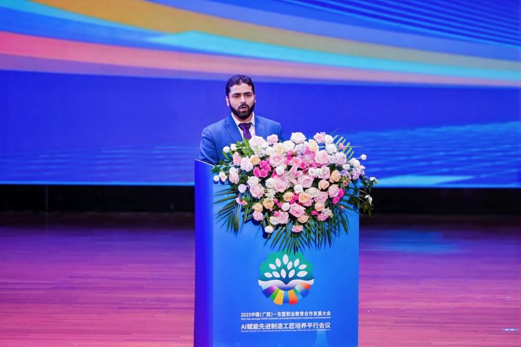 9月16日14时25分,文莱国立大学博士阿贾兹・艾哈迈德・巴特在2025中国(广西)—东盟职业教育合作发展大会“AI 赋能先进制造工匠培养”平行会议上作题为“应用人工智能与人工智能赋能的机器人技术”主旨报告。