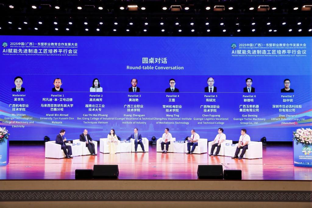 在圆桌对话环节,广西工业职业技术学院校长黄政艳、常州机电职业技术学院教务处副处长王霆、广西物流职业技术学院副校长陈赋光、马来西亚敦胡先翁大学巴莪分校校长阿凡迪·本·艾哈迈德、越南北江工业技术大专副校长高氏梅芳、深圳市优必选科技股份有限公司柳州制造中心总经理赵中锐以及广西玉柴机器集团有限公司副总经理郭德明等专家学者围绕“中国—东盟职业院校AI赋能先进制造工匠培养的挑战与应对路径”等热点议题畅所欲言,在观点碰撞与共识凝聚中,为区域产教深度融合与人才协同培养勾勒出了清晰的实施路径。圆桌对话环节由吴世先主持。