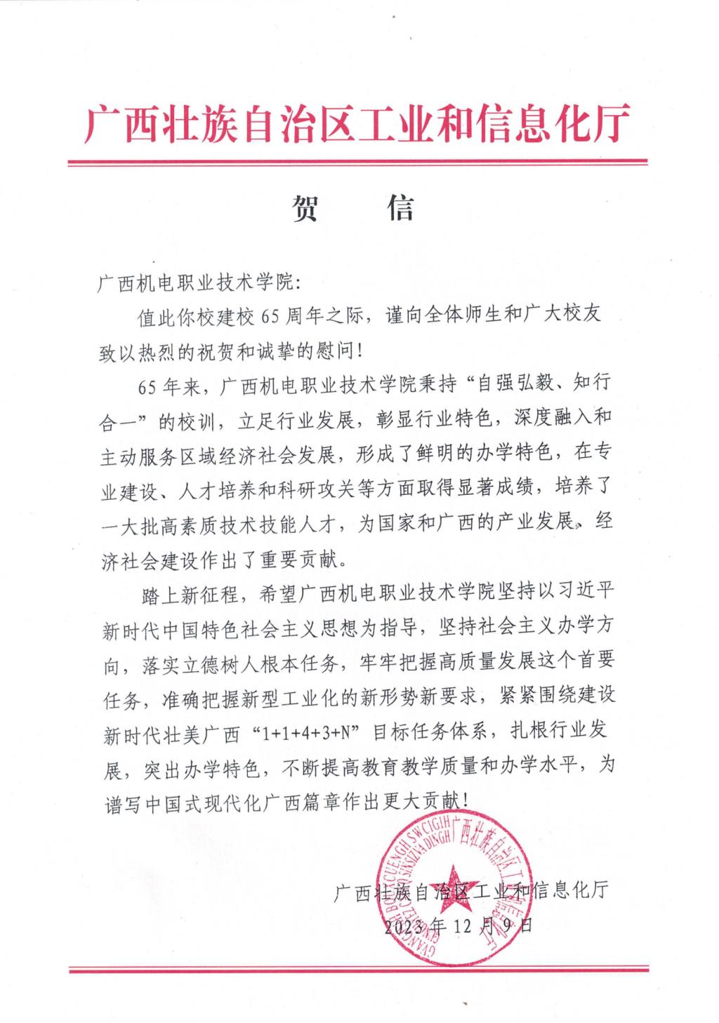 自治区工信厅给学校建校65周年发来贺信