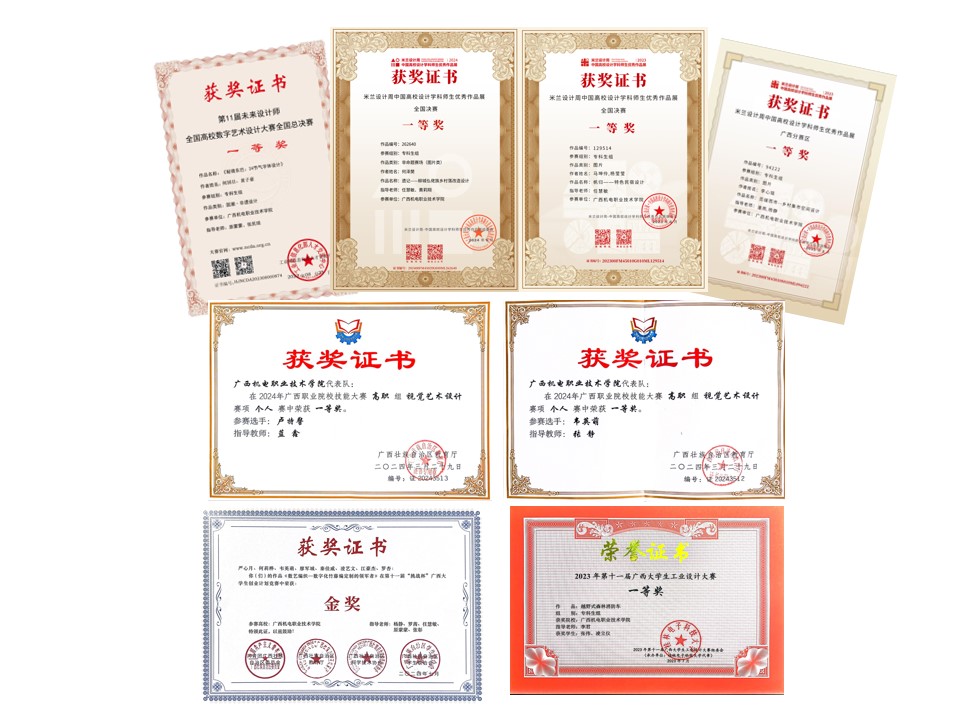 学院党委以党建引领和搭建“设计工匠”育人平台为抓手,坚持培育、培训、培养一起抓,品德修养、专业考核、综合实践“三把尺子一起量”,完善以思想政治建设为引领的“班主任工作室”“‘桂艺生花’辅导员工作室”制度,实行教授博士兼职做班主任、优秀班团干朋辈帮扶等育人工作新方式,做到“学生在哪里,党的组织就在哪里,党的工作、党的教育就开展到哪里”。近年来,学生斩获全国数字艺术设计大赛、米兰设计周作品展、“八桂天工奖”等国家级、省部级大奖达200余项;2024年工业设计专业2301班学生秦佳威勇夺第四届全国工业设计职业技能大赛(国家一类职业技能大赛)灯具设计师大奖。