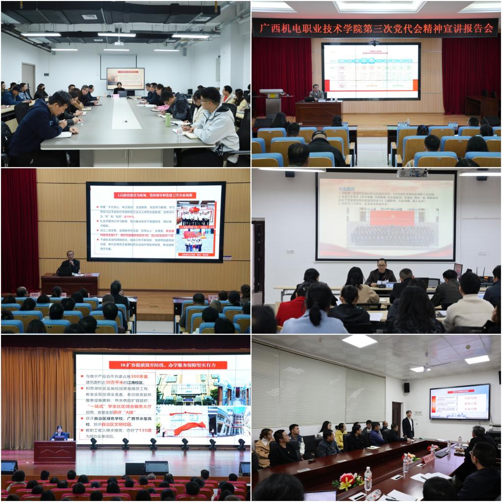 学校领导指出,学校第三次党代会是在全国上下深入贯彻落实党的二十届三中全会精神,全区上下全面贯彻落实习近平总书记对广西工作论述的重要要求,全校上下全面贯彻落实全国教育大会精神和自治区第十二次党代会及历次全会精神,以及全区教育大会精神之际,在以进一步全面深化改革奋力谱写中国式现代化广西篇章的重要时期,全力推动学校事业高质量发展迈上“建双高升职本”新起点的关键时刻召开的一次十分重要的会议,事关学校未来五年的改革发展,意义重大、影响深远。全体干部师生要深刻领会,准确把握学校“11159”发展战略,踔厉奋发、勇毅前行,在“建设广西领先、国内一流、国际知名高水平智能制造特色校”的新征途中彰显担当、铸就新绩。