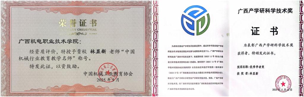 林显新老师始终以打造每一堂精品课为执教初心,坚守“育人先育魂”的教育理念,在传授专业技能的同时,更注重塑造学生的综合职业素养。他深耕教育教学改革领域,以敢为人先的魄力推动创新实践:主持省级“智能制造装备技术”专业教学资源库建设,为行业人才培养筑牢资源根基;主持两项广西职业教育教学改革研究项目——“新质人才培养驱动下的制造类专业群实践资源数字孪生创新建设研究”与“产教深度融合协同培养智能制造产业人才的研究与实践”,直击职业教育与产业发展的衔接痛点;更将研究视野拓展至国际领域,主持教育部职业教育发展中心项目“两国三地产教融合助力海外中资企业‘走出去、走得稳、走得远’”,为职业教育国际化探索新路径。此外,他以第一作者身份在《高教学刊》《广西教育》等优秀期刊发表7篇教改论文,主编数字化教材、双语教材及专著各1部,用理论成果反哺教学实践。其深耕不辍的教改探索,不仅赢得学生的真心拥戴,更收获同行的高度认可,成为职业教育领域兼具实践力与创新力的标杆人物。
