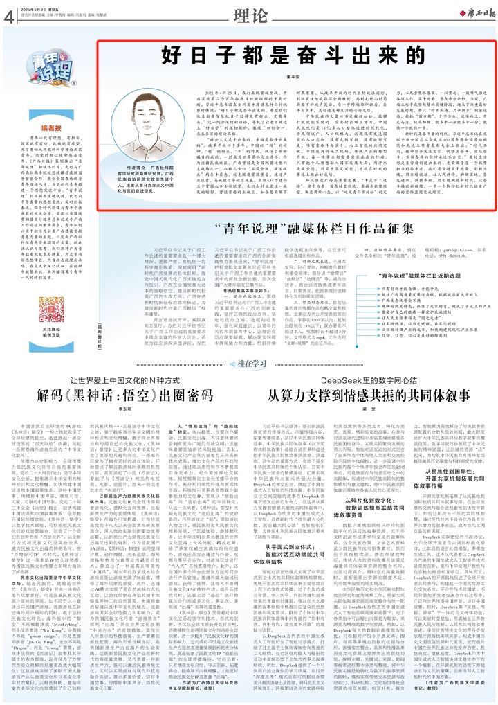 青年一代有理想、有担当,国家就有前途,民族就有希望。为了更好地用党的科学理论武装青年,用党的初心使命感召青年,《广西日报》策划推出“青年说理”融媒体栏目,先行与广西高职高专院校思政课建设联盟等紧密合作,聚合全国各地优秀青年理论人才,为Z世代青年搭建一个思想交流平台。“青年说理”栏目摒弃生硬说教,代之以平等真挚的思想交流;反对刻板表达,倡导时代价值与青年个性兼具的观点分享。首期栏目围绕贯彻落实习近平总书记关于广西工作论述的重要要求,青年如何以实干担当为壮美广西建设贡献青春力量的主题,刊发由广西社科院青年学者撰写的文章,就此谈认识与思考。我们期待广大青年朋友积极参与进来,用文字书写思想锋芒,用音画表现理论共鸣,在交流中深化认知,在论辩中凝聚共识,共同谱写属于青年一代的精彩篇章。