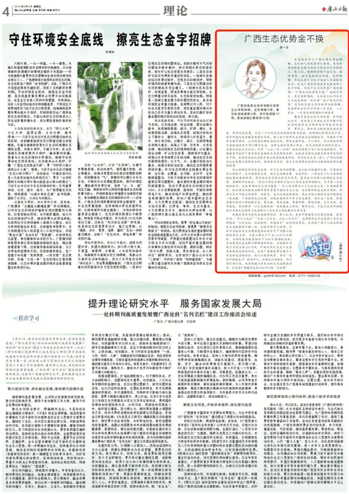 避免浅表化认知生态优势。在传统认知中,绿水青山多被认为是肉眼可见的景观资源或可供开发利用的实体资源。事实上,绿水青山的内涵远超风景美、资源足的表象。它是一个以生态系统健康发展为基础,能够稳定提供生态产品、经济价值与社会服务的复合系统,核心在于保障生态系统自我维持能力,关键在于维护生物多样性。以北部湾红树林湿地为例,即使未被开发、少人观光,但只要各种野生动植物在其中得以繁衍生息,生命支持系统得以维系,就是名副其实的绿水青山。石漠化地区也是如此,尽管“八山一水一分田”的地形限制了生产和生活的便利,但深藏其中的矿产资源却是其独特生态优势的体现。如能在石漠化治理与资源开发间寻求平衡,石漠化地区也是绿水青山的有机组成部分。作为生态大省(区),广西必须跳出认知表象化局限看全局,盘清殷实家底,将生态优势精准地转化为推动高质量发展的胜势。