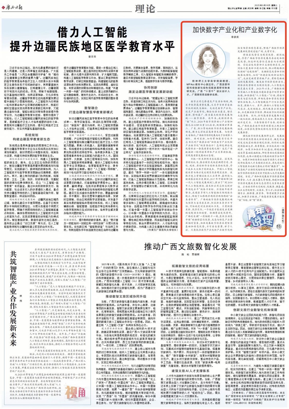 将潜在优势变为现实优势。理性地看,尽管广西数字经济发展存在后发和特色优势,但这种优势仍是潜在而非现实的。空谈后发优势却不主动创新求变,如同临川羡鱼却不退而结网,难以跨越路径依赖的“追赶陷阱”。坐拥特色优势却不积极落地转化,如同“怀抱金饭碗却沿街乞讨”,无法突破有资源缺产业、有特色缺效益的发展困境。激发数字经济创新活力,将潜在优势转变为现实优势,人工智能无疑是最大变量。2025年以来,广西抢抓国家实施人工智能能力建设普惠计划等重大机遇,加快推进“人工智能+”行动,将数字技术与区位优势、市场优势和资源优势紧密结合起来,人工智能赋能千行百业亮点纷呈、提振人心。其中,推动人工智能与现代农业、先进制造业、现代服务业深度融合,正是激活数字经济、释放数字红利的最大能量场。然而,任何高质量发展都不是一蹴而就的,需要涵养久久为功、厚积薄发的历史定力。只要坚持实干为要、创新为魂,广西就能在数字经济的赛道上跑出加速度,让潜在优势彻底转化为实实在在的发展胜势。