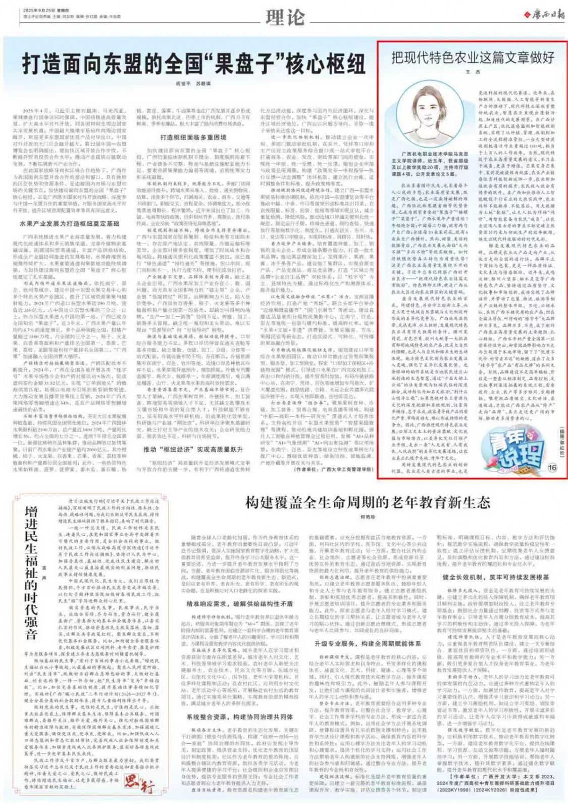 农业系着国计民生,也系着每个人心底的乡愁;农业高质量发展,既是广西之傲,也是一道亟待破解的难题。广西依托林果蔬畜糖等优势资源,已成为国家重要的“果盘子”“糖罐子”“菜篮子”。广西水果年产量连续7年领跑全国;中国每三勺糖,就有两勺产自广西;全球每10朵茉莉花,就有6朵来自广西横州。然而,甜蜜、美丽的数据背后,广西农业发展也面临“大而不强”“多而不特”等现实瓶颈。如何将规模优势真正转化为质量优势?这是广西农业高质量发展绕不开的关键。习近平总书记视察广西时开出良方——“把现代特色农业这篇文章做好”。特色牌即王牌,就是广西从农业大区迈向农业强区的关键密码。