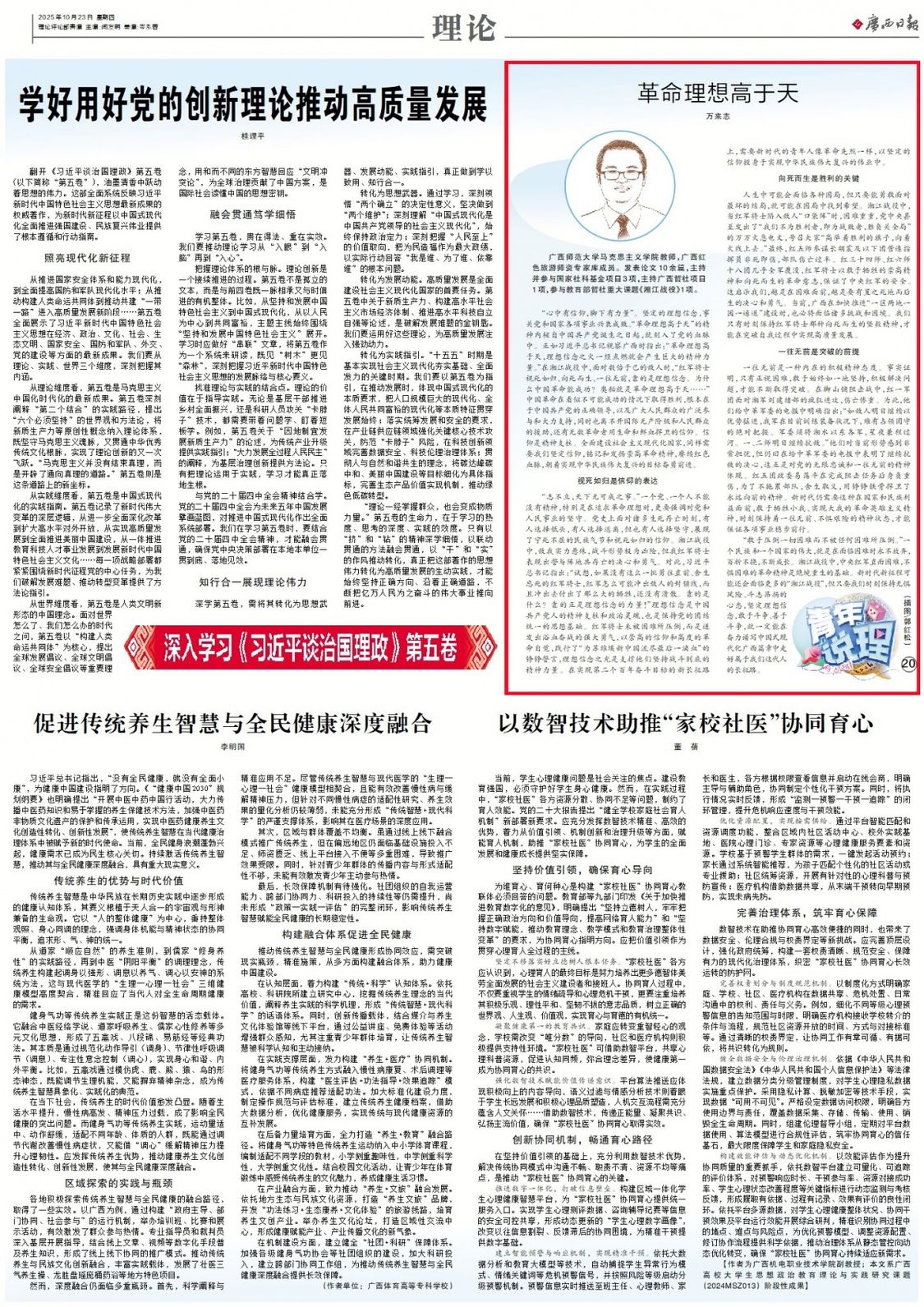 “心中有信仰,脚下有力量”。坚定的理想信念,事关党和国家各项事业兴衰成败。“革命理想高于天”的精神内核自中国共产党诞生之日起,就刻入了党的血脉中。正如习近平总书记视察广西时指出:“革命理想高于天,理想信念之火一经点燃就会产生巨大的精神力量。”在湘江战役中,面对数倍于己的敌人时,“红军将士视死如归、向死而生、一往无前,靠的是理想信念。为什么中国革命能成功?奥秘就是革命理想高于天……”中国革命在看似不可能成功的情况下取得胜利,根本在于中国共产党的正确领导,以及广大人民群众的广泛参与和大力支持,同时也离不开国际无产阶级和人民群众的援助,还有无数革命者用生命和鲜血捍卫的信仰。信仰是精神支柱。全面建设社会主义现代化国家,同样需要我们坚定信仰,铭记和发扬崇高革命精神,赓续红色血脉,朝着实现中华民族伟大复兴的目标奋勇前进。