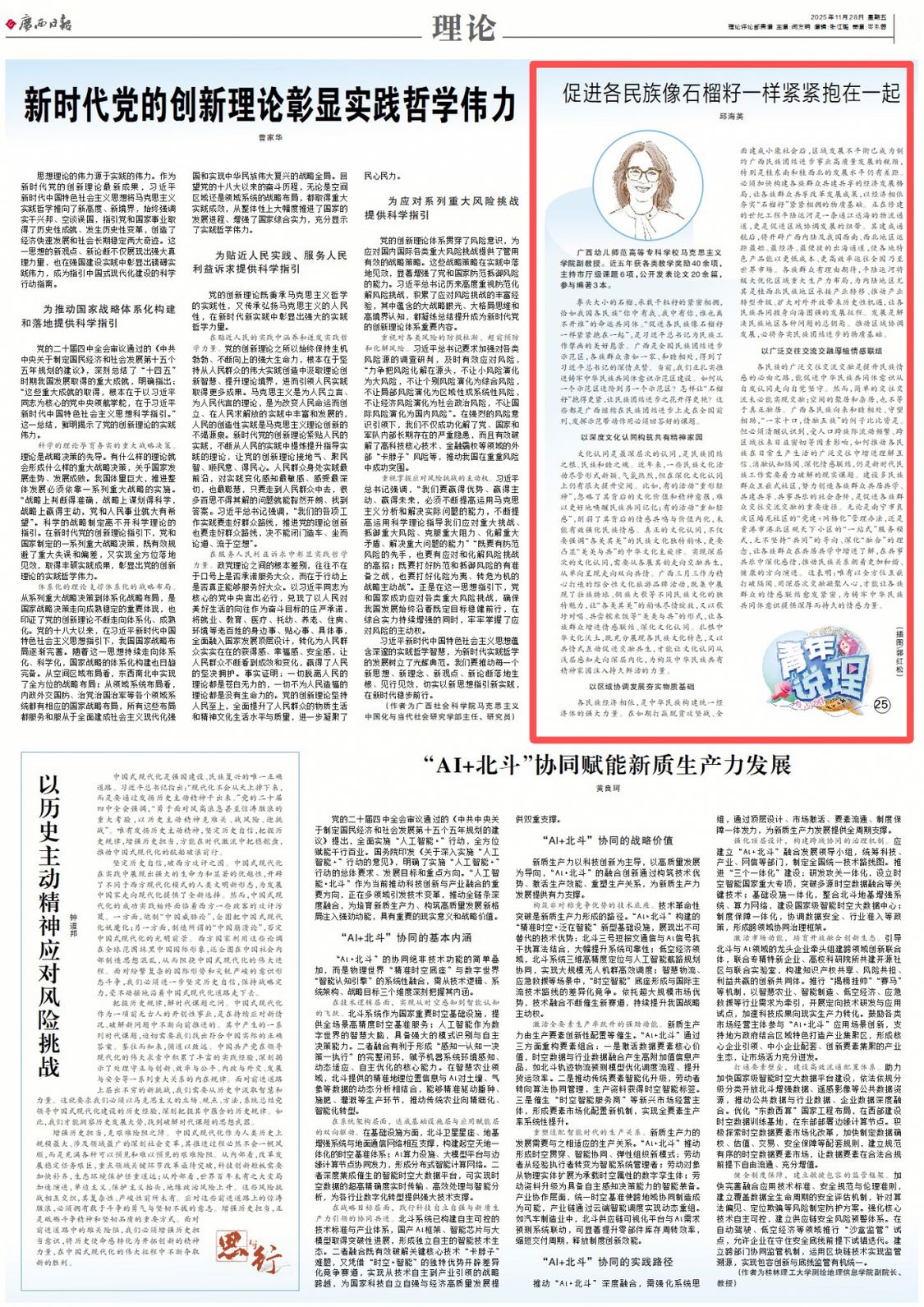 拳头大小的石榴,承载千粒籽的紧密相拥,恰如我国各民族“你中有我、我中有你,谁也离不开谁”的命运共同体。“促进各民族像石榴籽一样紧紧抱在一起”,是习近平总书记为民族工作擘画的美好愿景。广西是全国民族团结进步示范区,各族群众亲如一家、和睦相处,得到了习近平总书记的深情点赞。当前,我们正扎实推进铸牢中华民族共同体意识示范区建设。如何从一个示范区进阶到另一个示范区?怎样让“石榴籽”抱得更紧,让民族团结进步之花开得更艳?这些都是广西继续在民族团结进步上走在全国前列、发挥示范带动作用必须回答好的课题。