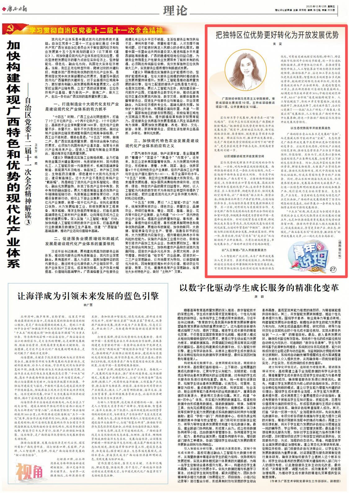 人工智能的广泛应用,正为广西开放发展注入更多活力。在提升通道能级上,西部陆海新通道沿线通过部署物联网和智能传感设施,可实现货物运输状态的实时追踪与路径动态优化,可有效突破地理空间局限;跨部门、跨区域数字化协同平台的逐步搭建,进一步打通机制衔接堵点,提升整体运行效率。在推动贸易转型升级上,人工智能算法可助力精准匹配跨境供需,推动临港产业、沿边加工等业态向区位更优区域集聚;智慧物流系统则整合多式联运资源,把地理空间转化为效率红利,促进要素高效流动与产业合理布局。在建设智慧化口岸上,在北部湾港钦州自动化集装箱码头,AI调度让作业效率提升30%;中越边境的凭祥口岸,AI以“分秒级”速度核验跨境货车。人工智能赋能下,传统口岸变智慧枢纽,通道能级提升了,物流成本降了,通关效率高了,企业信心更强了……依托“北上广研发+广西集成+东盟应用”发展路径,人工智能在广西对外开放中大展拳脚,将进一步推动广西的区位优势向开放发展优势转化。