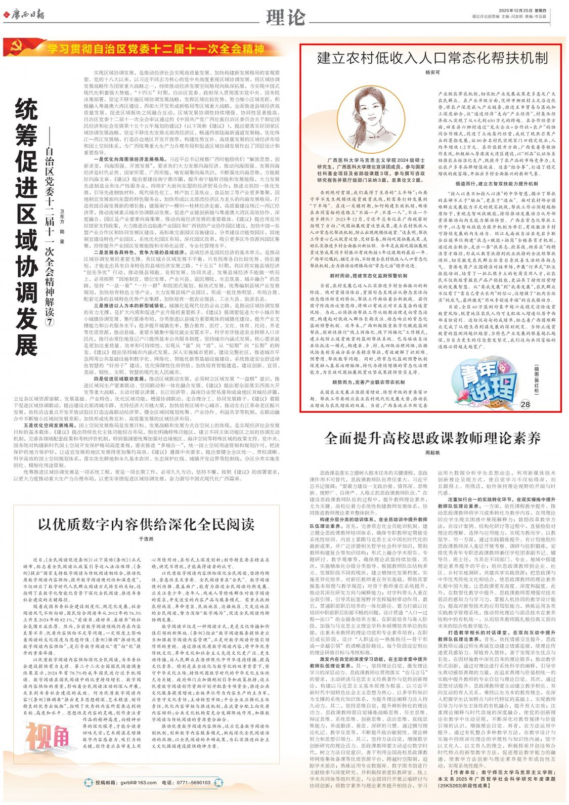 “授人以鱼不如授人以渔”的中华智慧,揭示了帮扶的真谛不止于“输血”,更在于“造血”。面对农村部分困难群众发展能力不足的现实挑战,帮扶工作必须超越物质给予,重视志智双扶赋能,持续推动发展动力从外部资源驱动向内生能力驱动转型。广西在常态化帮扶工作中,以志智双扶能力提升机制为牵引,有效激活乡村可持续发展的内生动力。环江毛南族自治县龙岩乡联合后援单位构建“扶志+赋能+拓岗”全链条育才机制,通过政企联合,走出一条“扶其志、授其技、助其业”的精准育才路径,形成从教育扶持到就业扶持的全流程帮扶闭环,切实激发农民群众依靠自身改善生活的昂扬志气。贵港电商产业园精准对接市场,开展“订单式”职业技能培训,培育了一批扎根乡土的电商实用人才,让农民不仅熟练掌握农产品产销技能,更涵养了持续经营增收的发展智慧。从“要我发展”到“我要发展”,农民群众不仅有了“靠自己骨头长肉”的信心,还增强了“把肉长结实”的底气,最终激发“用双手创造幸福”的自我驱动力。