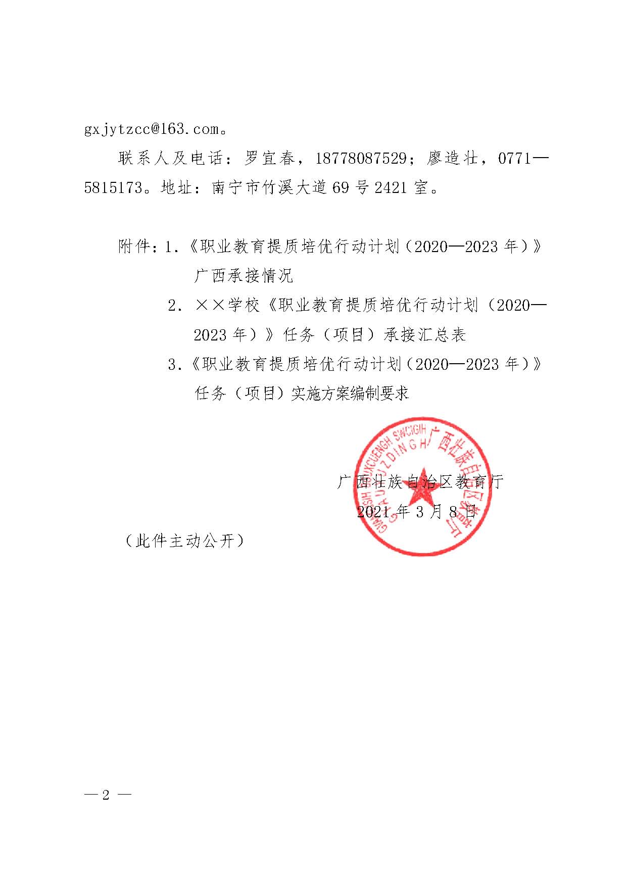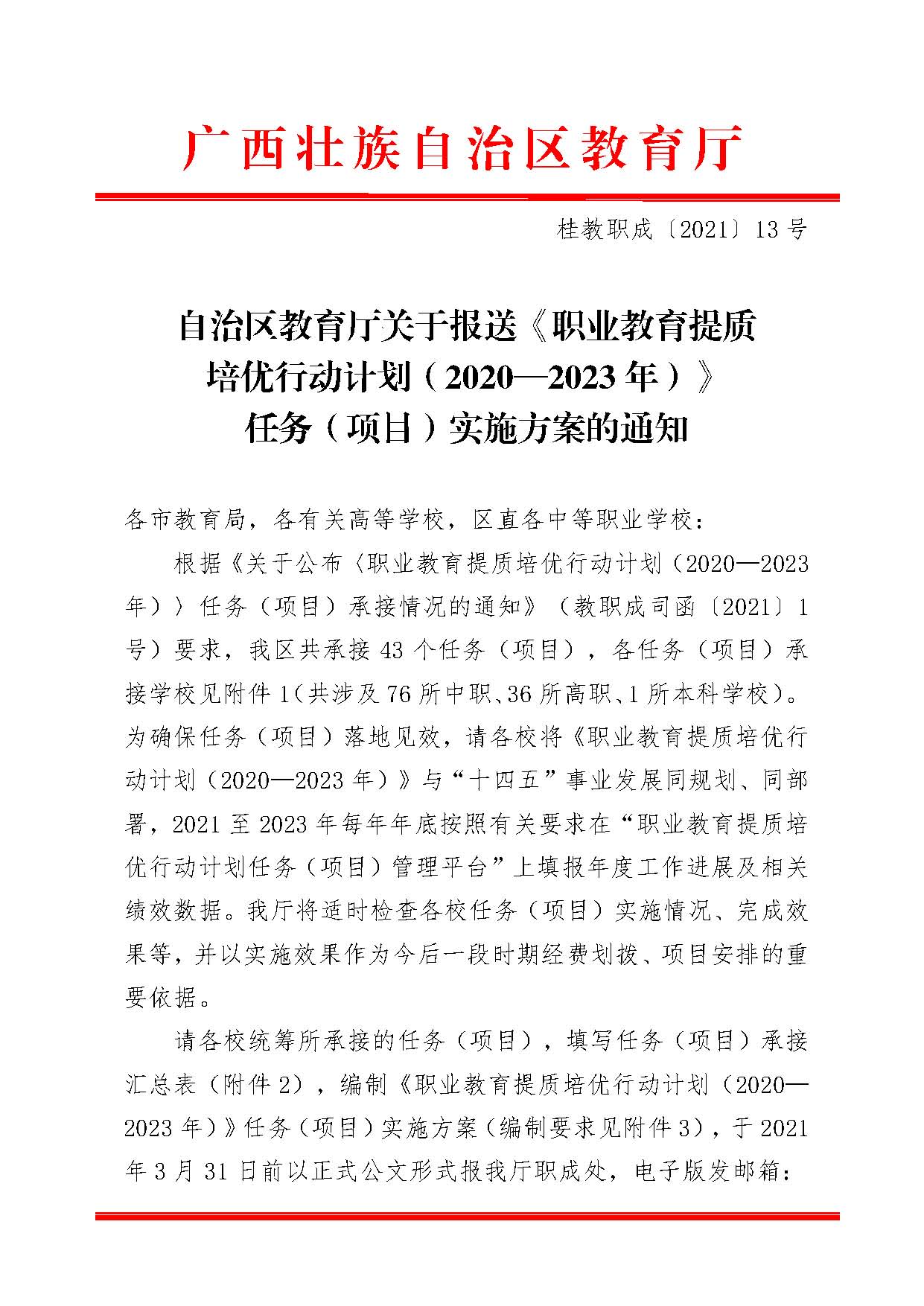 桂教职成〔2021〕13号自治区教育厅关于报送《职业教育提质培优行动计划(2020—2023年)》任务(项目)实施方案的通知