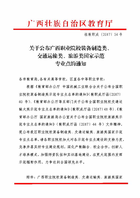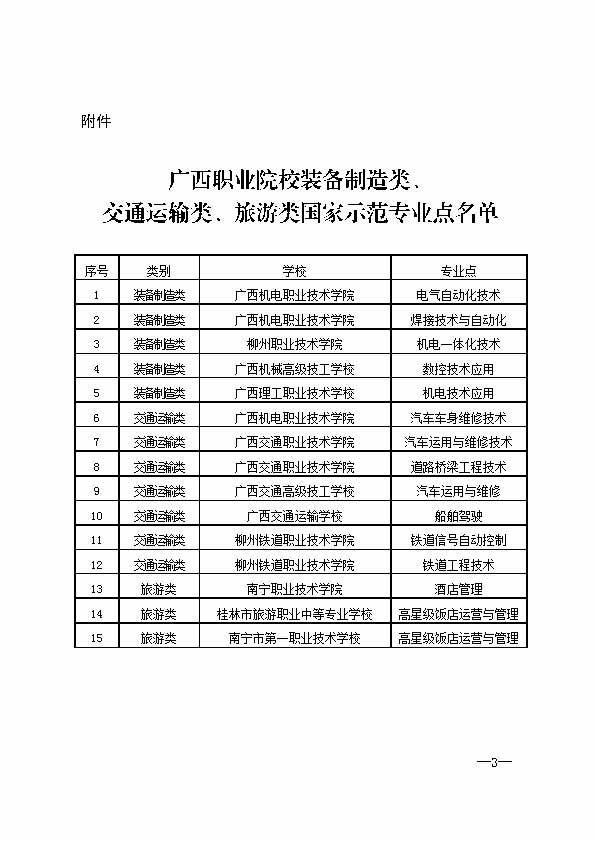 关于公布广西职业院校国家装备制造类、交通运输类、旅游类示范专业点的通知