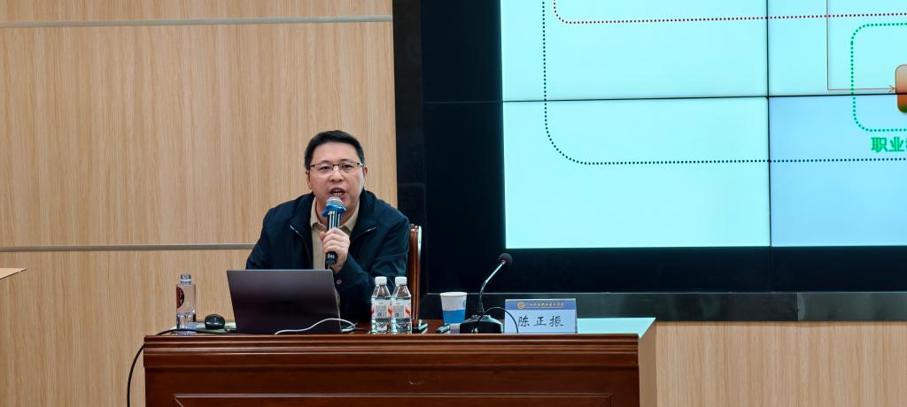 本次报告会特邀全国优秀教育工作者、全国黄炎培职业教育杰出名师、国家教学成果一、二等奖获得者——柳州职业技术大学副校长陈正振教授作题为“教育强国背景下高职‘新双高’建设与‘五金’关键要素改革”的专题报告。陈正振从教育强国下的现代职业教育体系结构入手,系统阐述了高质量实施“新双高”建设的核心要义与切实路径。他结合多年职教改革实践经验,对“五金”关键要素的内涵、关联与改革重点进行了深入剖析,强调“五金”协同是推动高职教育内涵式发展、增强适应性和服务能力的重点支撑。