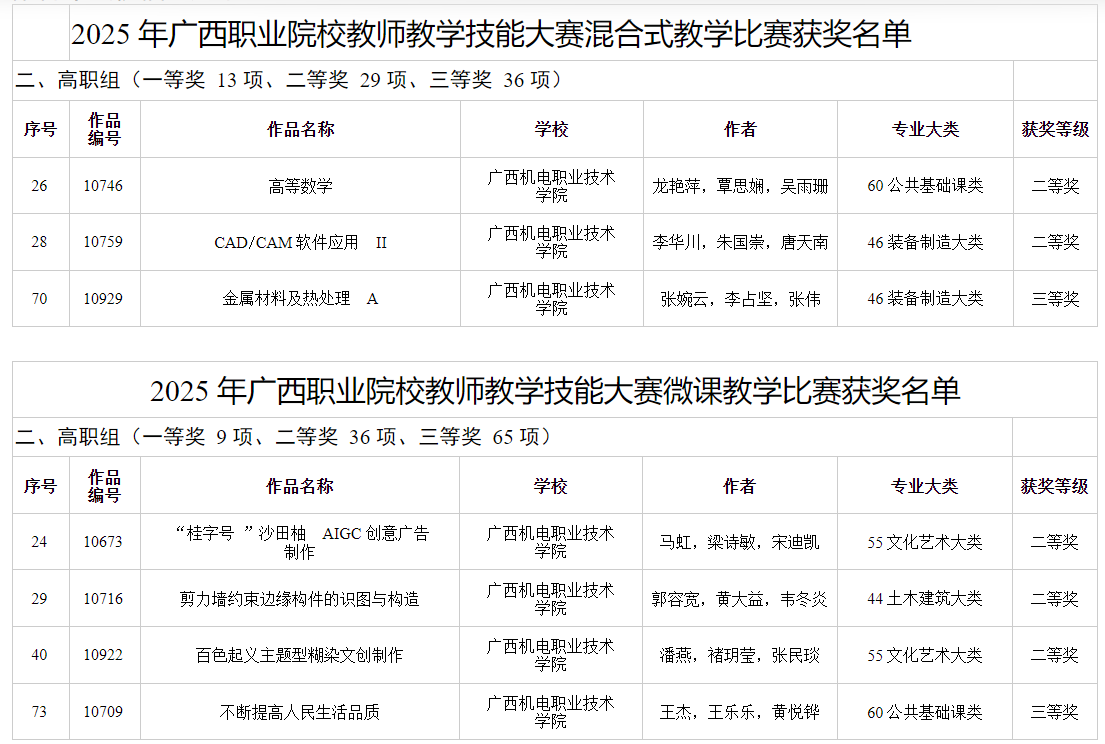 近日,自治区教育厅相继下发《自治区教育厅关于公布2025年广西职业院校教师教学技能大赛混合式教学比赛及微课教学比赛获奖名单的通知》及《自治区教育厅关于公布第二十四届广西高校教育教学数字化大赛获奖名单的通知》。taptap官网教师在两项赛事中表现突出,喜获13个奖项。综合此前揭晓的2025年广西职业院校教师教学技能大赛课堂教学比赛成绩,taptap官网在2025年全区两大重要教学能力赛事中累计获奖19项,其中一等奖1项、二等奖13项、三等奖5项,成果喜人。
