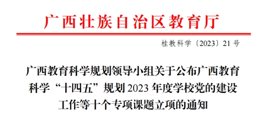 广西教育科学“十四五”规划2023年度专项课题旨在推动广西高校教育改革发展,深入研究高校教育教学的重点及难点问题,落实高校教育建设发展规划的有关要求,推进教育建设工作高质量发展。