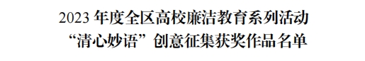 此次高校廉洁教育系列活动,以“廉洁润初心 铸魂担使命”为主题,围绕推动党员领导干部廉洁从政、教师廉洁育人、学生廉洁养成,分知识问答、作品征集和案例展示三个单元。作品经征集推荐、评审分为“廉心文语”校园征文、“润心话语”视频、“清心妙语”创意三大类成果。