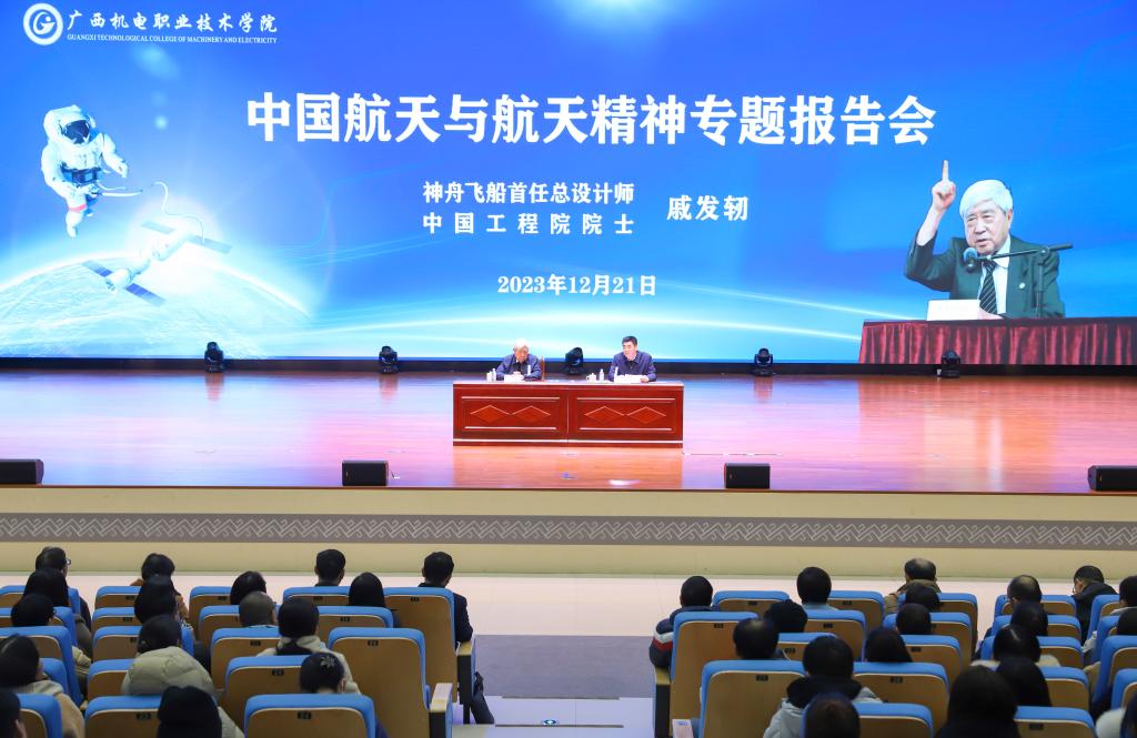 12月21日下午,taptap官网弘毅大礼堂座无虚席,神舟飞船首任总设计师、中国工程院、国际宇航科学院戚发轫院士受邀做客taptap点点官网“机电讲堂”,以“中国航天与航天精神”为主题为广大师生带来了一场别开生面的科普思政报告会,讲述了中国航天人奔赴星辰大海的浪漫与执着。taptap官网和来自驻邕5所高校的近1600余名师生现场聆听了报告。报告会由学校党委书记黄小敬主持。学校党委副书记、校长吴世先等校领导与师生代表一起参加了报告会。