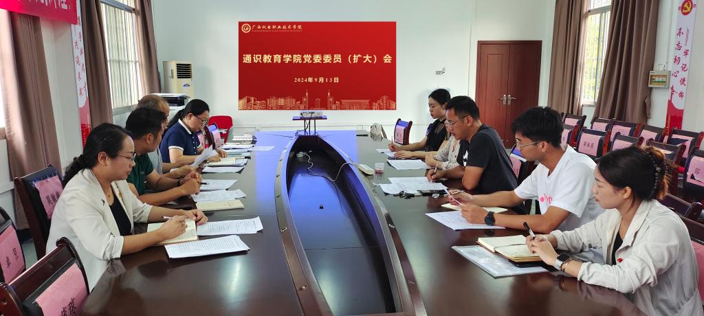 2024年9月13日17:00,通识教育学院在学院三楼会议室召开了党委委员(扩大)会。通识教育学院党委副书记梁瑾同志主持会议,学院院长周运金列席会议,学院领导莫敏燕、卓倪,党支部委员以及组织员参加会议。