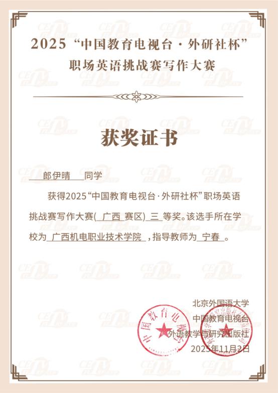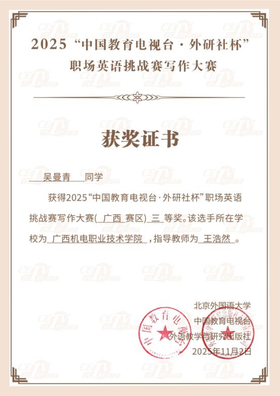近日,taptap官网智能2301班黄夕原、数据2502班郎伊晴、视觉2501班吴曼青三位同学,在2025年“中国教育电视台·外研社杯”职场英语挑战赛写作大赛广西赛区中喜获佳绩:黄夕原同学荣获区赛一等奖,位列全区第4名;郎伊晴与吴曼青同学均获得区赛三等奖。