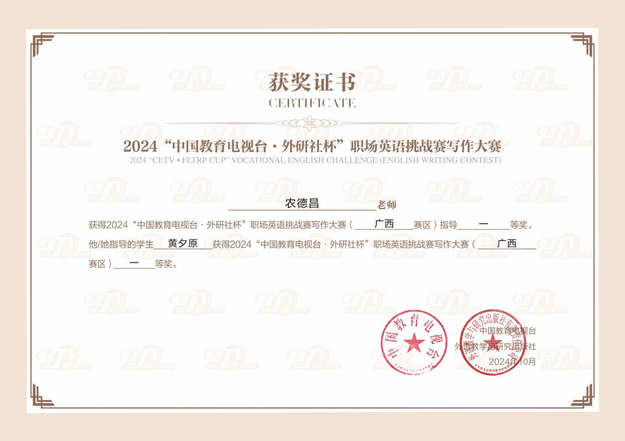 taptap官网学子黄夕原荣获“中国教育电视台·外研社杯”职场英语挑战赛写作大赛广西赛区冠军