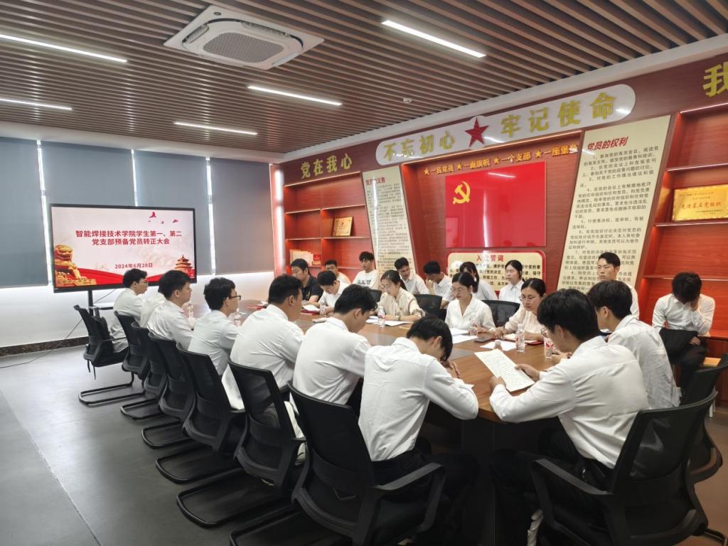 为进一步加强党员队伍建设,切实提高党员发展质量,保持我院党组织的生机与活力,6月28日上午9时,智能焊接技术学院学生第一、二党支部在笃行楼528室召开预备党员转正大会,讨论刘寒冬等十五名同志转正问题。会议由学生第一党支部书记王胜兰主持,党支部委员、预备党员以及入党积极分子等出席活动。