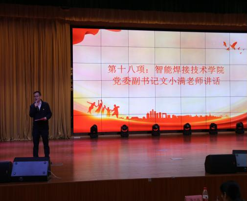 学院团委副书记胡海明同学向全院团员青年发出如下倡议:一是坚定不移跟党走,做有理想的焊接青年;二是胸怀“国之大有者”,做有担当的焊接青年;三是锤炼过硬本领,做肯奋斗的焊接青年,并呼吁同学们高举团结的旗帜,砥砺奋进,奏响灿烂夺目的青年篇章。