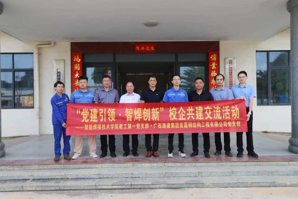 8月14日下午,智能焊接技术学院副院长龙昌茂、专业负责人肖勇、博士教师朱征宇、技能大师钟星河一行四人,赴扶绥县广西路建集团宏嘉钢结构工程有限公司,开展以“党建引领・智焊创新”为主题的党支部共建交流活动。本次活动由智能焊接技术学院教工第一党支部与广西路建集团宏嘉钢结构工程有限公司党支部联合举办。公司党支部副书记杨清煌、技术中心办公室主任蒙雪宁等出席会议。