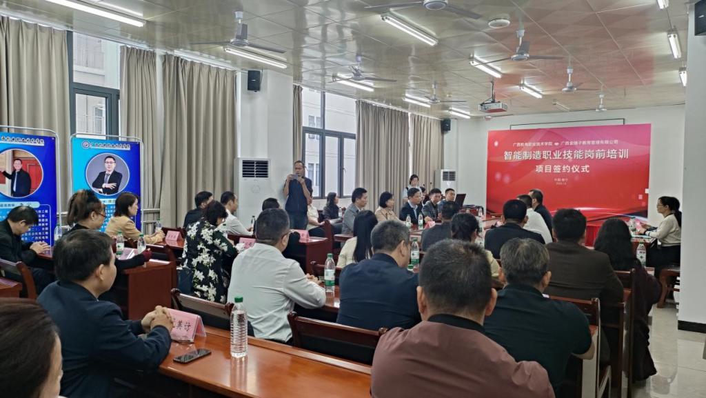金秋送爽,丹桂飘香。10月31日上午,我院与广西金锤子教育管理有限公司在智能焊接实训中心隆重举行联合开展智能制造职业技能岗前培训项目签约仪式。我院李宁院长、金锤子教育陈金铭总经理出席仪式并致辞,双方项目管理团队核心成员、区内多家普通高中及中职学校校长与教师代表以及新闻媒体人士等二十余位嘉宾共同见证了这一重要时刻。