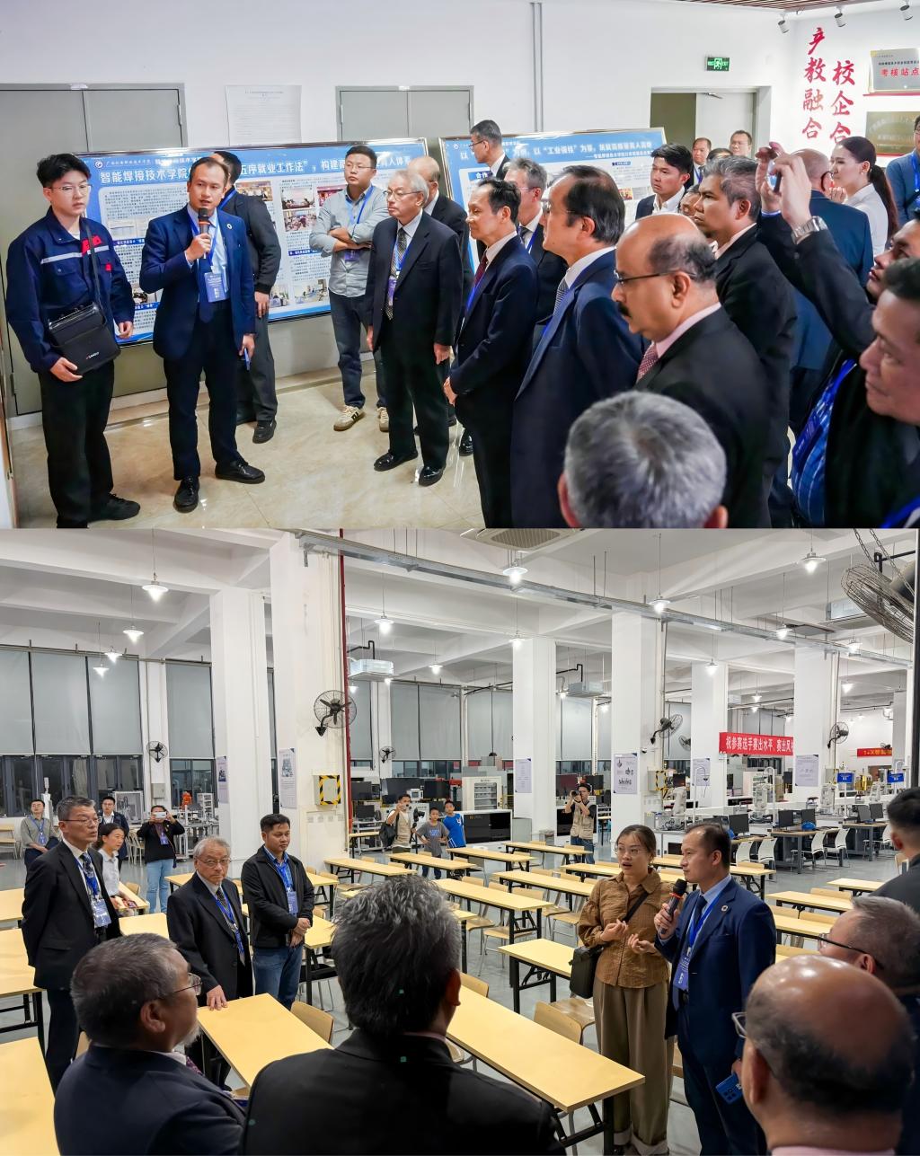 会议结束后,参会外宾参观了我院智能焊接技术中心和工业机器人 “1+X” 考培中心。我院教师向外宾介绍了专业建设成果与实训设施,展现了我院在焊接技术和工业机器人方面雄厚的人才培养实力。智能焊接技术学院院长李宁、副院长龙昌茂和副院长李玺全程陪同。