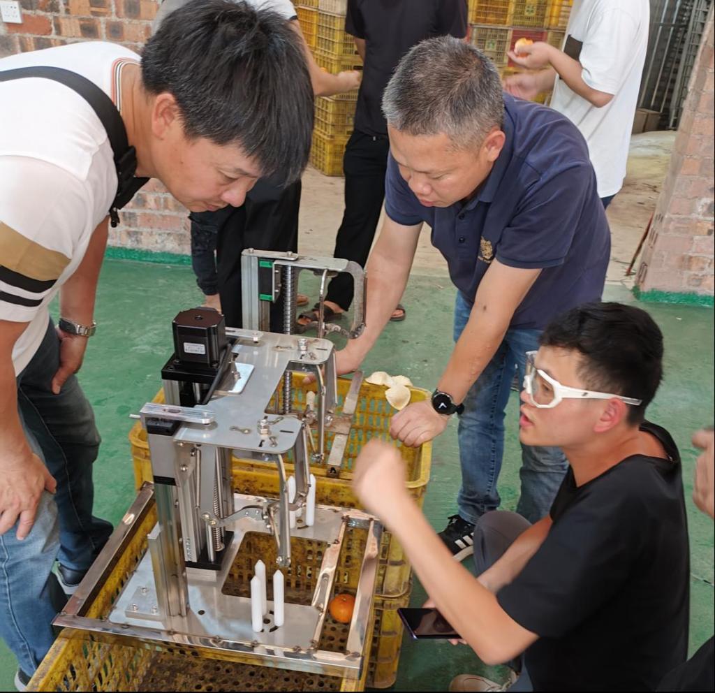 抵达调研地,柑香先锋队便与当地村支书、柑橘种植大户、陈皮加工小作坊代表开展座谈。首先,柑香先锋队何斌同学围绕技术落地场景,从设备适用性、成本效益、技术等方面构思进行介绍,并现场进行演示操作流程,双方对推动柑橘产业升级的深入探讨。