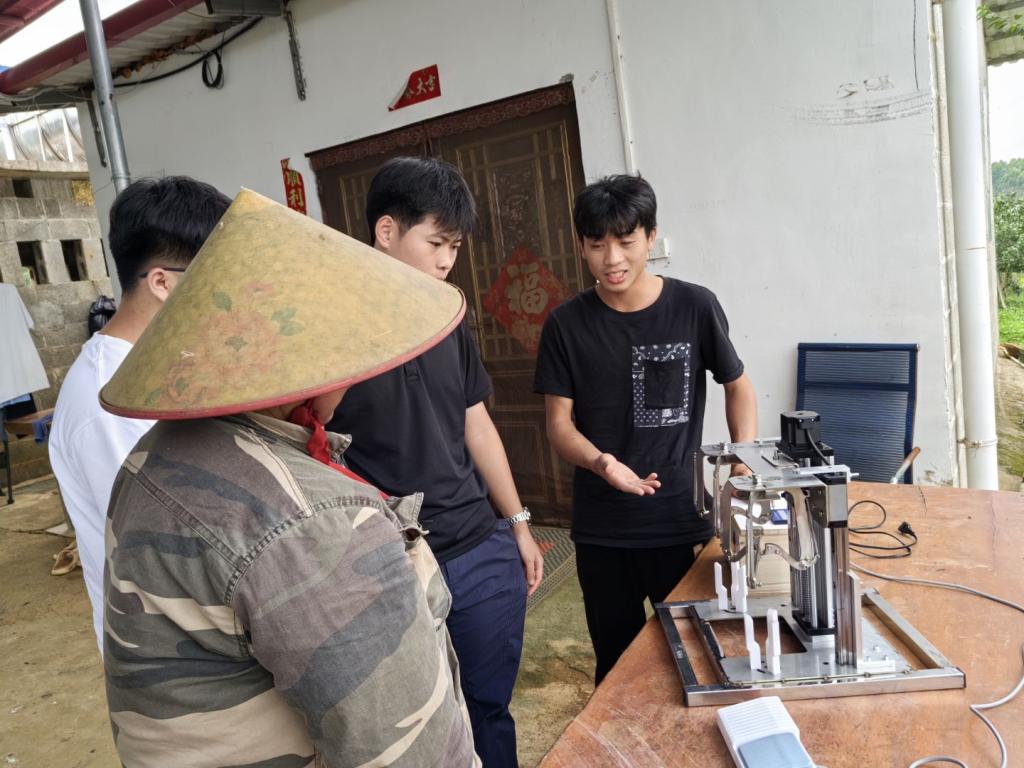 现场,团队成员廖立伟向果农详细讲解了开皮机的高效分选、无损去皮等功能,并现场演示操作流程。机器仅需3秒即可完成单次双个柑橘去皮,且果肉完整率超过95%,大幅降低了人工成本与损耗率。果农王陈大叔体验后称赞道:“以前手工去皮既慢又浪费,现在用机器省力又增收!”
