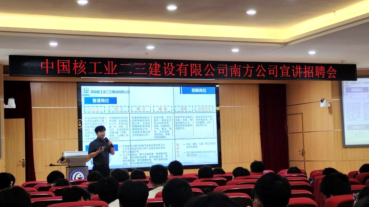 随后,中国核工业二三建设有限公司在博远楼5楼1号报告厅举办了专场招聘宣讲会。会上,招聘经理王家旺先生作为主讲人全面介绍了中核二三的发展历程、企业文化、业务领域及未来发展前景,并就同学们关心的应聘条件、岗位要求、薪资待遇、职业发展等问题进行详细说明。